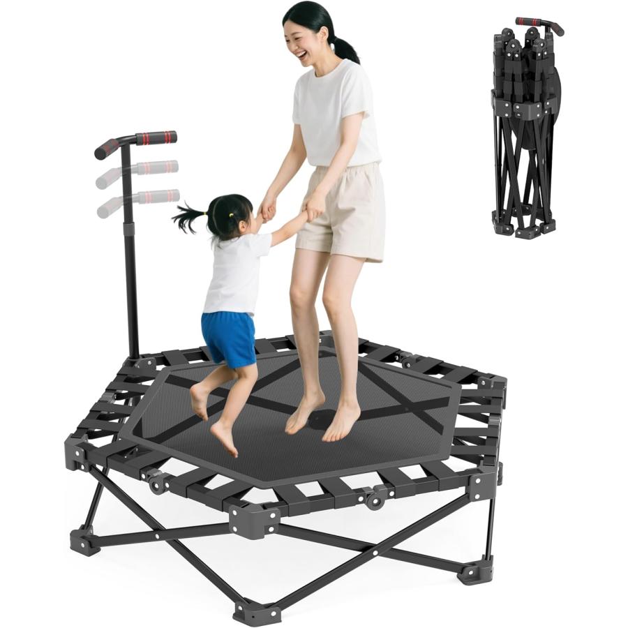 トランポリン折りたたみ式 静音設計 手すり付き 3段階調節 耐荷重150kg トランポリン 室内 折りたたみ式 静音設計 手すり付き 3段階調節