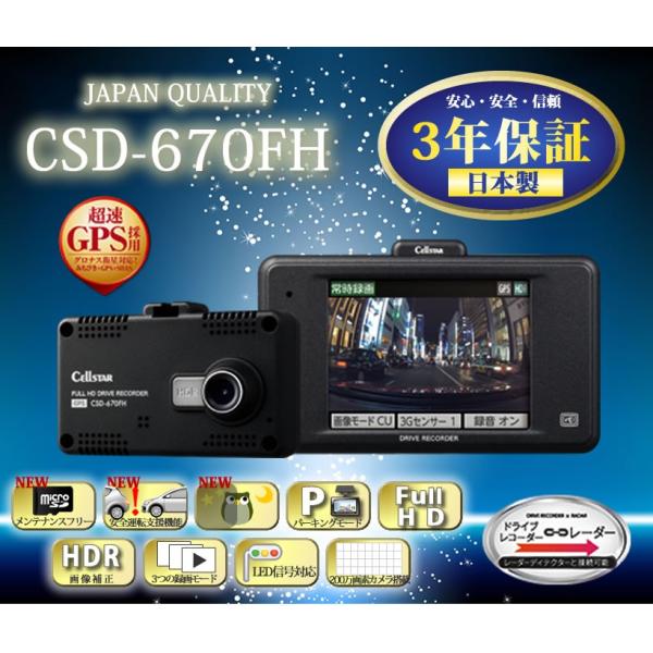 | 商品の特徴 | Bris様専用】CELLSTAR CSD-670FH 3セット 販売済み Bris】CELLSTAR。Bris様専用】CELLSTAR CSD-670FH 3セット 販売済み Bris】CELLSTAR。Amazon | セルスター ドライブレコーダー CSD-670FH 日本製3年保証。【新品・未開封品】在庫少なくなってきたためご購入はお早めに!価格交渉中でも先にご購入された方を優先いたしますので、ご了承下さい。用品の種類...ドライブレコーダー本体撮影タイプ...前方撮影【車外撮影用カメラ】●撮像素子:200万画素 SONY Exmor CMOSセンサー●フレームレート:30fps●視野角:水平/116.3°、垂直/59.6°、対角/145.1°●F値:2●最低被写体照度:5LUX【本体】●録画画素数:200万画素(FullHD)●録画画質・FullHD:高画質(12Mbps)、標準(10Mbps)、低画質(8Mbps)●録画圧縮:録画AVI(H.264)、静止画JPEG●対応外部記憶媒体:microSDカード8GB~32GB(クラス10/SDHC規格準拠、NANDタイプは「MLC」を推奨)、64GB(クラス10/SDXC規格準拠、UHSスピードクラス:UHS-1以上、NANDタイプは「MLC」を推奨) ※セルスター社オプションmicroSDカード推奨●電源電圧:DC12V/24V●寸法:本体/W8.7×H5.1×D2.25cm(突起部含まず)、マウントベース取り付け時/H8.2cm●質量:本体/89g●付属品:ドライブレコーダー本体、マウントベース、ボールジョイント、DCコード(3極DCプラグ)、両面テープ(フロントガラス用、ダッシュボード用)、16GB microSDカード クラス10/SDHC規格準拠(専用ビューアソフト入り)※SDカード変換アダプタ・SDカードケース付、コードクリップ×5、脱脂クリーナー、取扱説明書#セルスター工業#CSD_670FH用品の種類...ドライブレコーダー本体撮影タイプ...前方撮影。CELLSTAR(セルスター) 【ドライブレコーダー 】セルスター GPS内蔵。Amazon参考価格→18000円複数個購入希望の方は対応いたしますので商品コメントにて、お申し付けください。 | ||