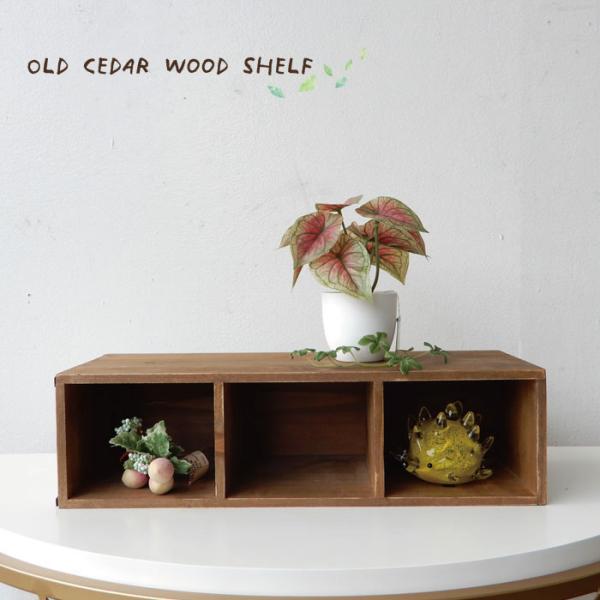- 棚・ラック・シェルフ > 木製ラック・ウッドラック > 【アンティーク】ヴィンテージ 棚 ウッドラック 木製棚 3段 昭和 ティスプレイ 杉古材 シェルフ 3マス 棚固定 ウッド ラック 棚 小物展示 店舗什器