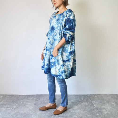 - キッチン・食器 > エプロン・三角巾 > UZUIRO ウズイロ チュニック割烹着 ゆるふわシルエット ブルーまだら チュニック割烹着 ゆるふわシルエット/4カラー/三河織物 エプロン