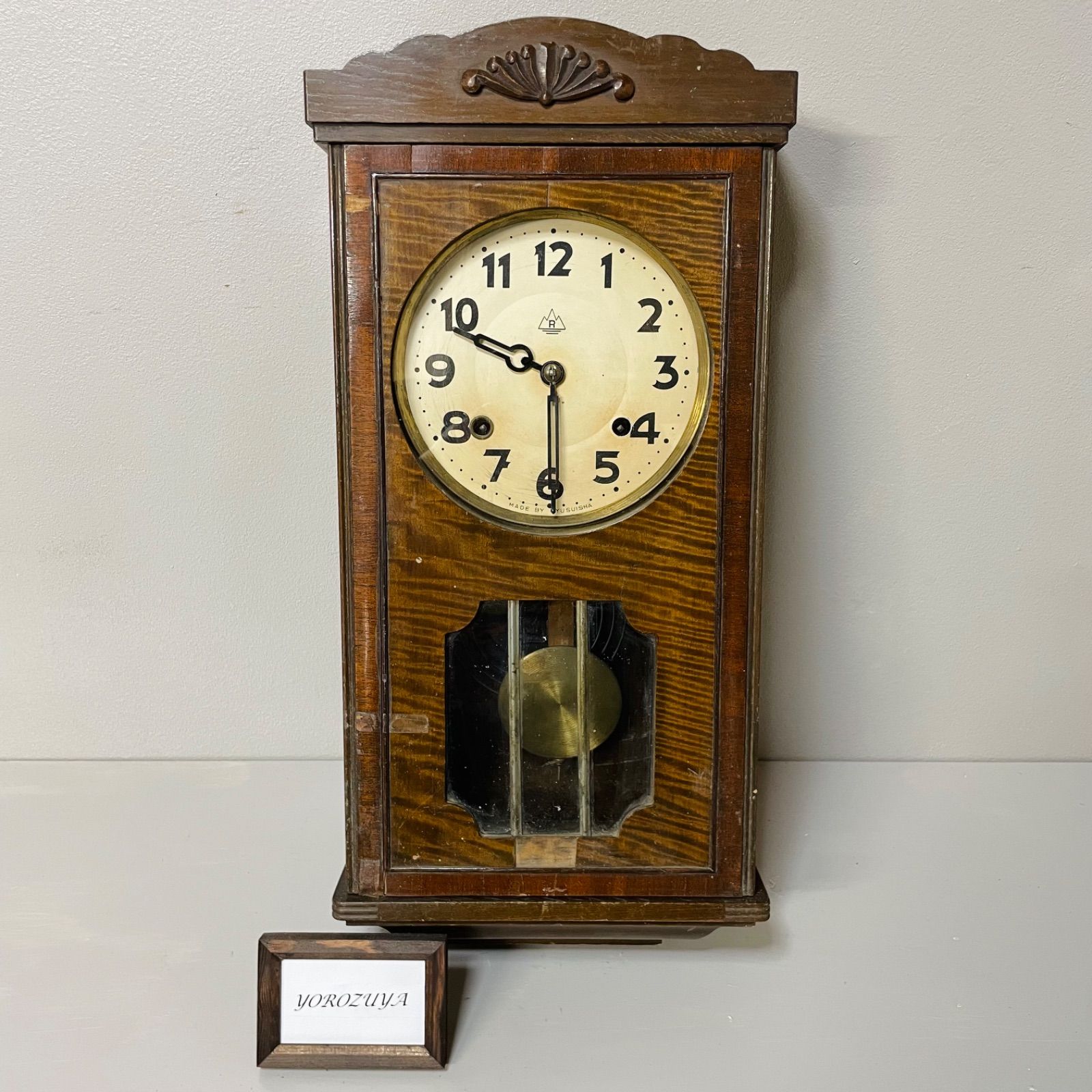 | 商品の特徴 | アンティーク振り子時計 林時計 Prince 31DAY's 修復済品 稼動中。アンティーク振り子時計 林時計 Prince 31DAY's 修復済品 稼動中。壁掛け振子時計 | 林時計製 - レア物・骨董・アンティーク|レトロな。林時計製造の宮型本打ち式31日巻柱時計です。振り子、ネジ巻き付属です。とても扱い易い素直な一台です。ダブルハンマーの和音タイプです。とても優しい音色です。半も1回鳴ります。サイズは 約56x26x12.5cm程度。修復内容:①入庫時の状況は、接着剤が枯れており、フロントドア枠がグラグラでした。一度バラして組み上げました。②上部宮型飾りの両端チョコレート色のコーナー部分がそれぞれ欠損していました。木工で補完しました。③振り子の鏡面がくすんでいたので磨きました。④カム角度調整をして給油済です。以上の手直しをして元気に稼動中です。バッドポイント:・フロントドア向かって右下部に表層の欠けが有ります。味だと考えそのままにしています。・小さなスレや打痕は複数箇所有ります。グッドポイント:・一枚ガラスは装飾カットの当時ものです。・本打ち式ですので、短針でボンボンの鳴る回数をセット出来ます。(時刻セット後、次に鳴る時にアジャストされます。)・31日巻なので手間が掛かりません。初心者の方には、設置して稼動するまでメッセージでご不明な点をサポートします。振り子デビューに是非ご検討くださいませ。。ユンハンス 柱時計 アンティーク ゼンマイ時計 振り子時計 掛時計。。【希少品】SEIKO からくり時計 パペットシリーズ ミキハウス MQ920R。ユンハンス 柱時計 古時計 振り子 ゼンマイ アンティーク レトロ 精工舎。尾張時計 U型 柱時計 古時計 振り子 レトロ 精工舎 ゼンマイ ボンボン 雑貨。からくり電波時計 スモールワールド 4MN490RH リズム時計。シチズン パルミューズクイーンダム 振り子 メロディ 壁掛け 電波時計。鳩時計 RHYTHM 2羽鳩カッコーテレスR(彩色)-16。【デッドストック】インダストリアル調 大型クロック 動作確認済み。〈完動・美品〉精工舎① 十二吋グレシャム丸型ゼンマイ振り子時計。【ジャンク品】ロレックス ROLEX サブマリーナ掛け時計 非売品 難あり。e Nelson Iclock.ジョージネルソン アイクロック。美品 RHYTHM リズム Small World 4MH754 からくり時計。値下げ 渡辺力 八角形 ローズウッド 掛時計。となりのトトロ 振り子時計 掛け時計。Arne Jacobsen アルネヤコブセン 壁時計 29cm【ジャンク品】。希少 ピーターラビット メロディ掛時計 4MH776。美品✨セイコークロック からくり掛け時計 正時パフォーマンス&メロディセレクト。Vitra ヴィトラ ジョージ・ネルソン サンバースト 正規品 ジャンク品。スモールワールド からくり時計 掛け時計 クォーツ時計 レア。電波掛け時計 くまのプーさん 8MX407MC03-3。シチズン 振り子時計 掛け時計 30Day アンティーク ビンテージ。動作確認済 セイコー ディズニータイム ファンタジア からくり時計 FW668B | ||