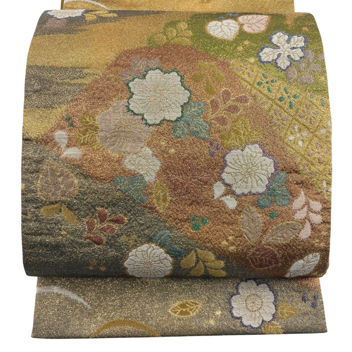 - レディース > スーツ・フォーマル・ドレス > 袋帯 美品 逸品 引箔本金紹巴 菱重ね鏡文 金糸 金色 お太鼓柄 正絹 美品】 袋帯 秀品 霞 草花 箔 金糸 山吹茶色 お太鼓柄 正絹|中古