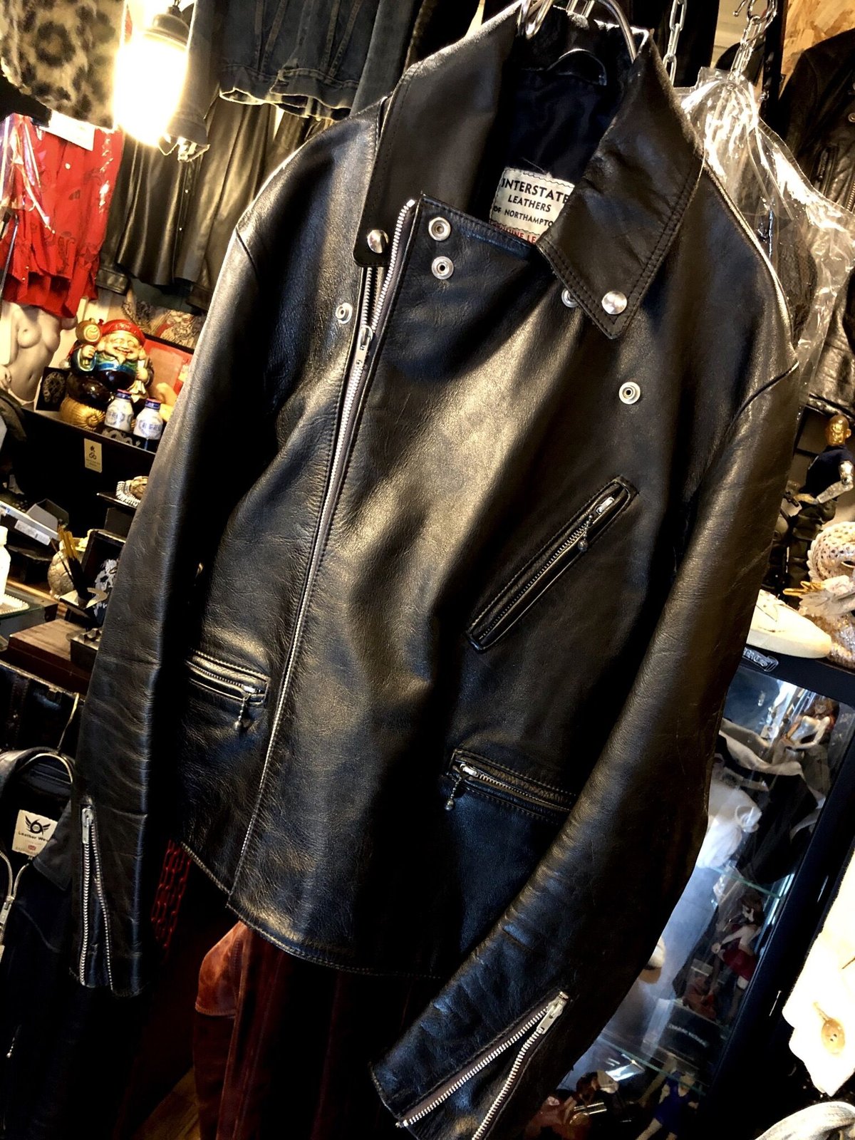 | 商品の特徴 | 超目玉伝説UKブランド70,s激ヤバサイクロン》イングランド製70年代中期。超目玉伝説UKブランド70,s激ヤバサイクロン》イングランド製70年代中期。70's INTERSTATE Leathers Ltd. / Great Britain】 70年代に英国で展開。ご覧いただきありがとうございます。こちらは INTERSTATE LEATHERS of GREAT BRITAIN 製の推定1970年代 シングルライダースジャケットです。英国レザー史の裏側を支えた知る人ぞ知る名門であり、かつてルイスレザーのOEMを行っていたことでも知られる老舗ファクトリーです。当時の職人たちが、ルイス同等のクオリティで自社名義として製造した稀少な1着になります革質は非常に密度が高く、厚みのあるフルグレインレザーを使用。70年代英国レザー特有の艶やかで重厚な光沢はまさに当時の本物を感じられる極上の質感です。ディテールも非常に通好みで、・エルボーパッチ仕様・OPTI ZIPオリジナル・スタンドカラーのシングル構造といった、現代では再現が難しいクラシックディテールが揃っています。サイズ表記:UK 38(日本サイズ M〜L相当)肩幅:49㎝袖丈:56㎝わき下身幅:49㎝ウエスト身幅46㎝着丈:66㎝※ 170cm前後の方でジャスト〜ややタイトめな着用感です革の状態は非常に良く、全体的に艶やかでヴィンテージとしては美品クラスかと思います本物志向の方、70s英国レザーをお探しの方にぜひおすすめです☆お使いいただける方おりましたらどうぞ!。超目玉伝説UKブランド70,s激ヤバサイクロン》イングランド製70年代中期。。バックラッシュ イタリアンショルダーシングルライダース 1254-01 xs。FAKTOR ファクター レザージャケット イタリア製 本革製 Mサイズ。【POLO RALPH LAUREN】ラルフローレン レザージャケット ブラウン。美品 DIESEL ディーゼル ライダースジャケット 黒 | ||
