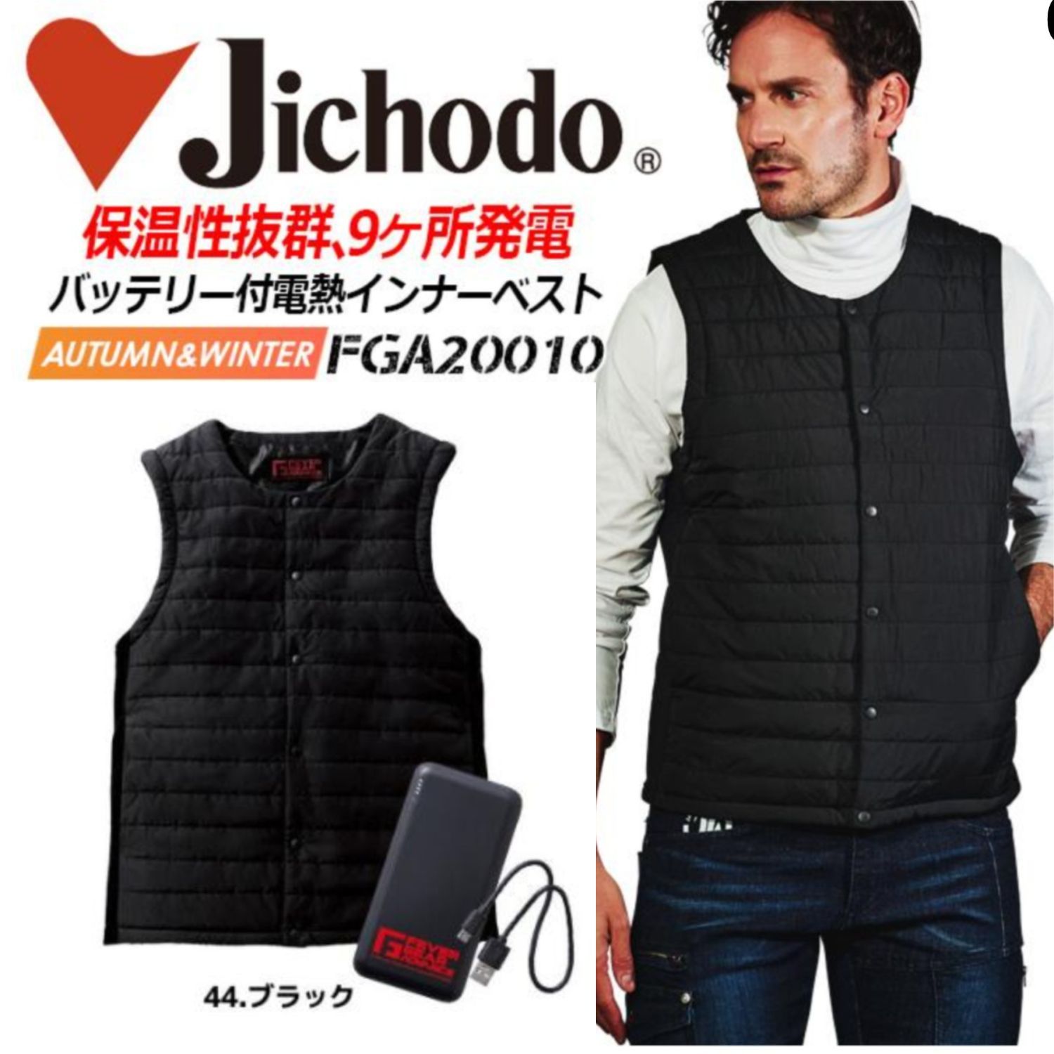 - 健康用品 > 冷え対策・保温グッズ > 自重堂 電熱インナー フルセット ベスト 黒 M 防寒着 保温 FGA20010 新品・未開封】 自重堂 FGA20010 電熱インナーベスト バッテリー付き